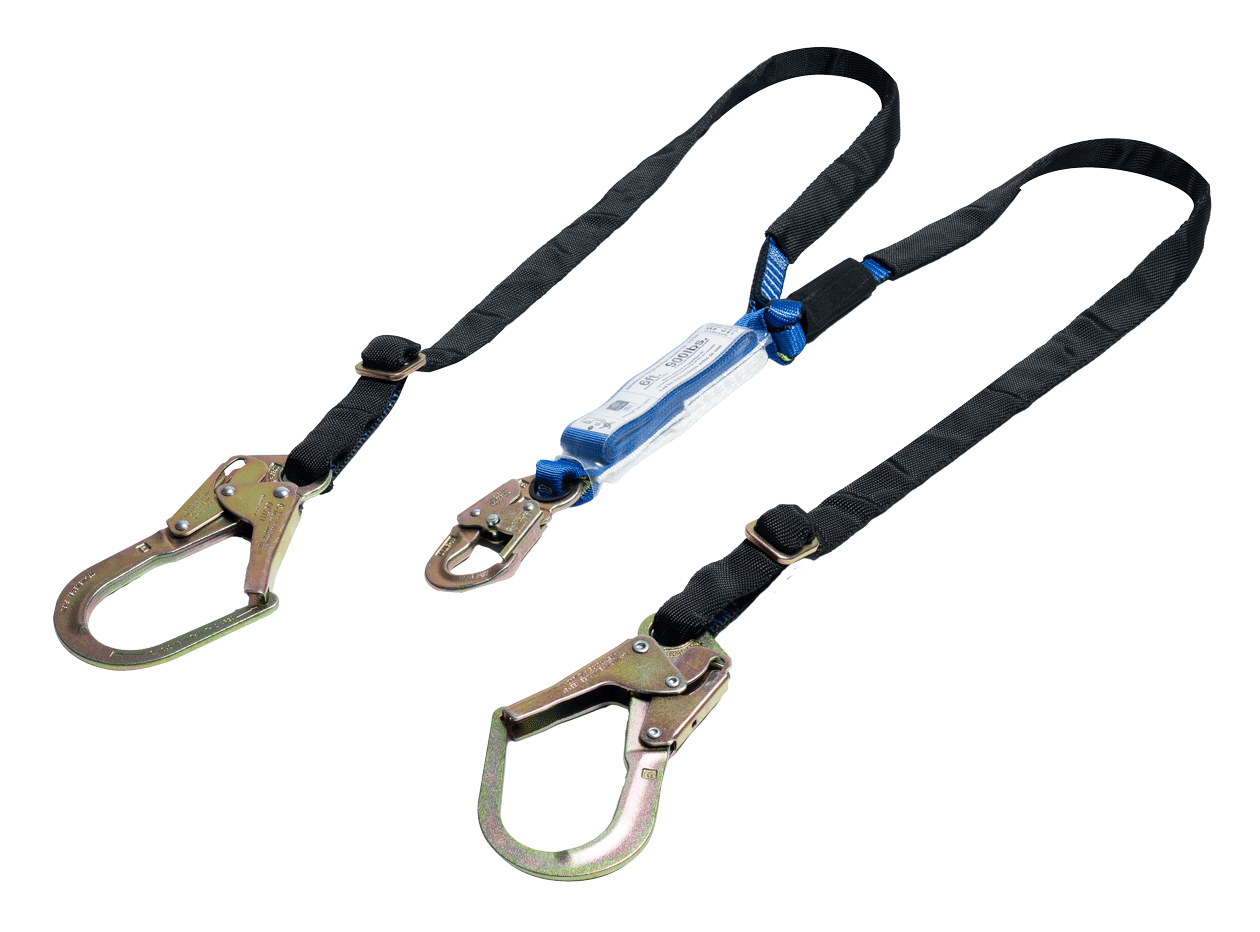 Eslinga de detención doble en Y en reata poliéster de 25mm longitud graduable de 1,80m con doble gancho grande 2½ pulgadas (65mm de apertura) y (1) gancho pequeño ¾ pulgadas (21mm de apertura ). Reata 100% de poliéster resistente a la tensión y abrasión de 25 mm de ancho. Incluye bujes plásticos que protegen la reata de fricción. Equipo Certificado por ICONTEC en cumplimiento con ANSI/ASSE Z359.13 -2013.