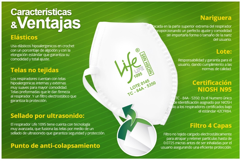 La mascarilla para polvo Life Referencia 1095 para partículas N95 brinda una efectiva, confortable e higiénica protección respiratoria contra la gran mayoría de polvos y partículas. Es un respirador plegable con materiales de construcción ligeros que dan mayor comodidad al usuario y promueven mayor tiempo de uso.