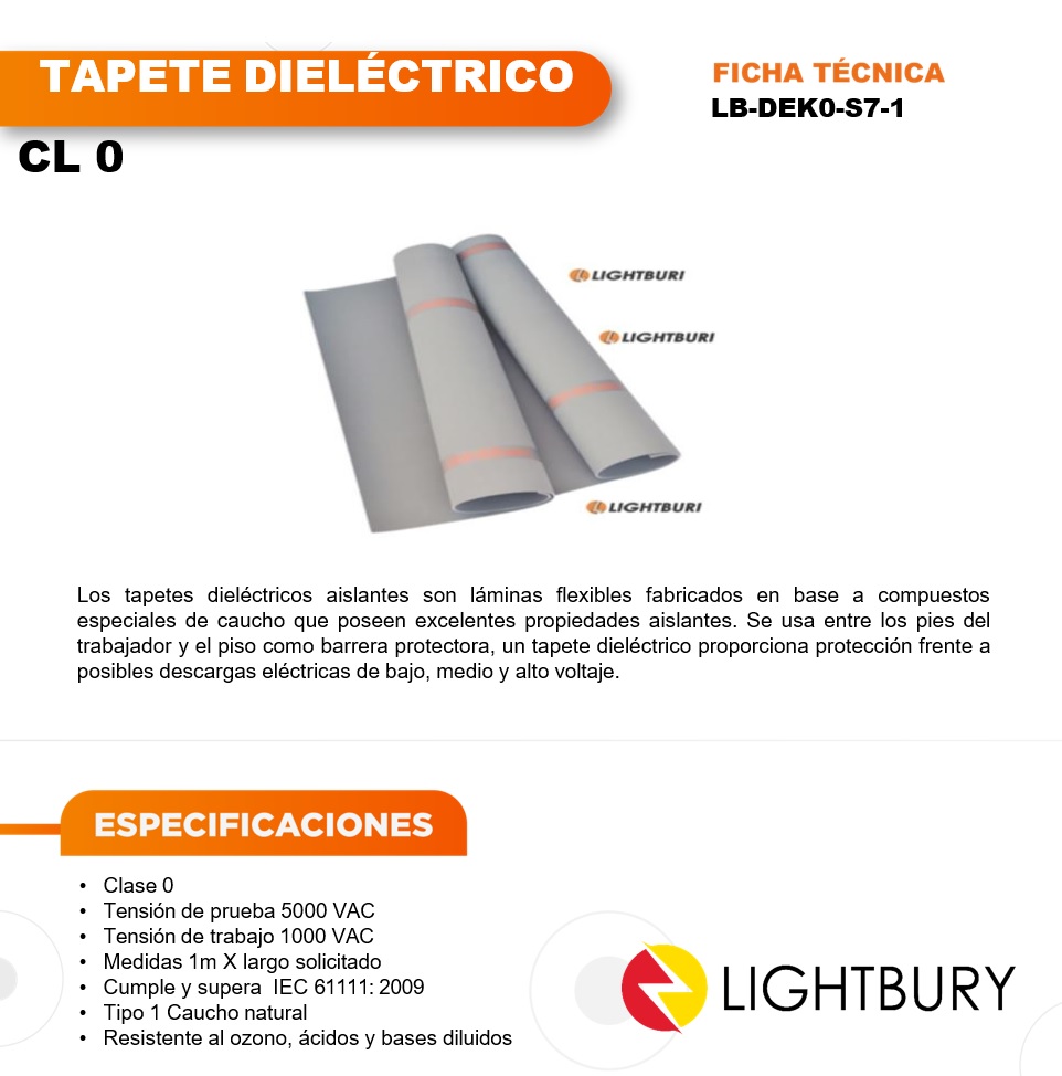 Alfombra con diseño en superficie mil rayas. Mezcla en caucho aislante con propiedades dieléctricas. Utilizada comúnmente para cubrir pavimentaciones y pasajes de centrales eléctricas, cabinas eléctricas, locales industriales etc. Tension de perforación: 30.000 Voltios. Peso: 4,5 Kilogramos.