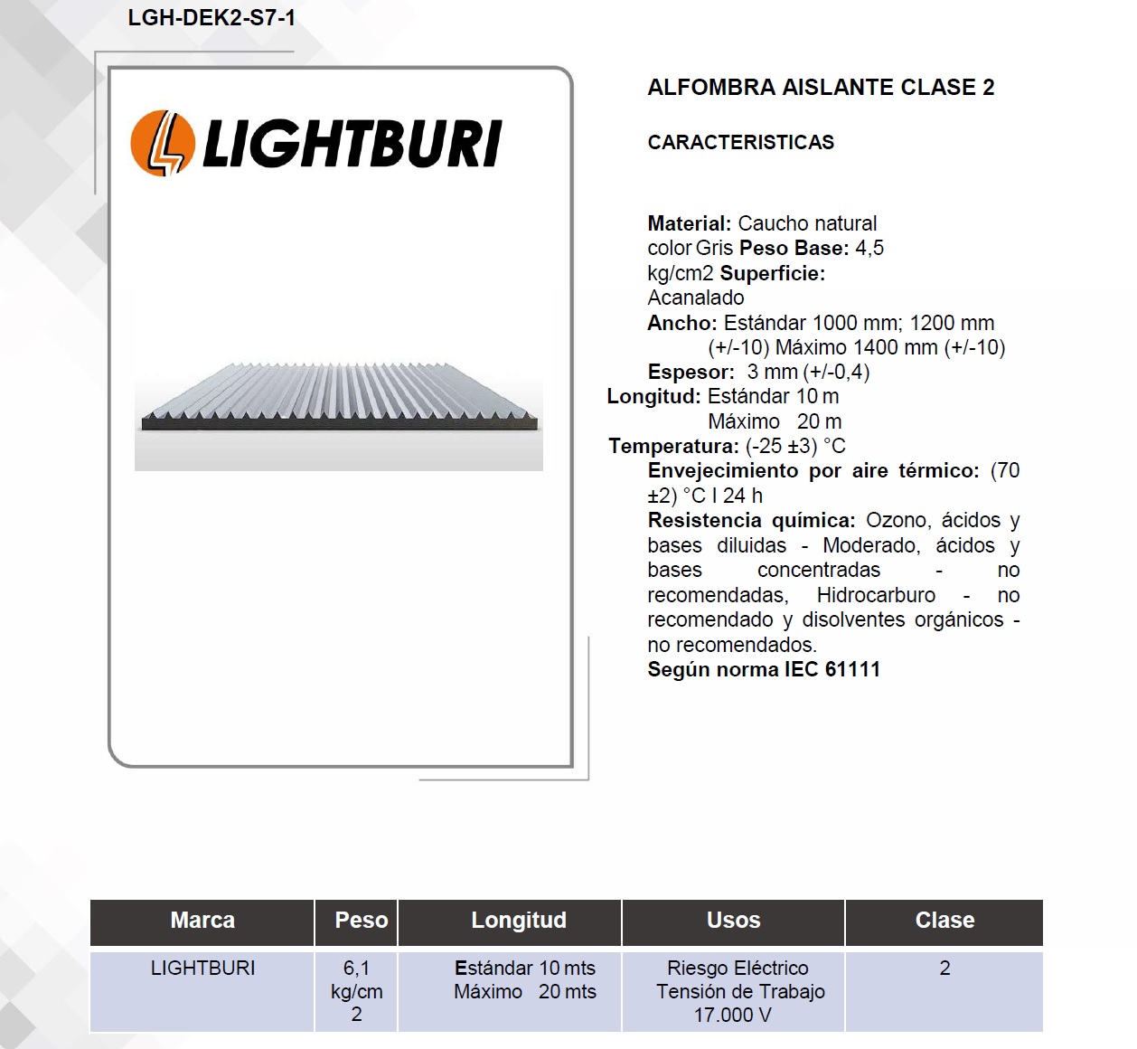 Alfombra con diseño en superficie mil rayas. Mezcla en caucho aislante con propiedades dieléctricas. Utilizada comúnmente para cubrir pavimentaciones y pasajes de centrales eléctricas, cabinas eléctricas, locales industriales etc. Tension de perforación: 30.000 Voltios. Peso: 4,5 Kilogramos.